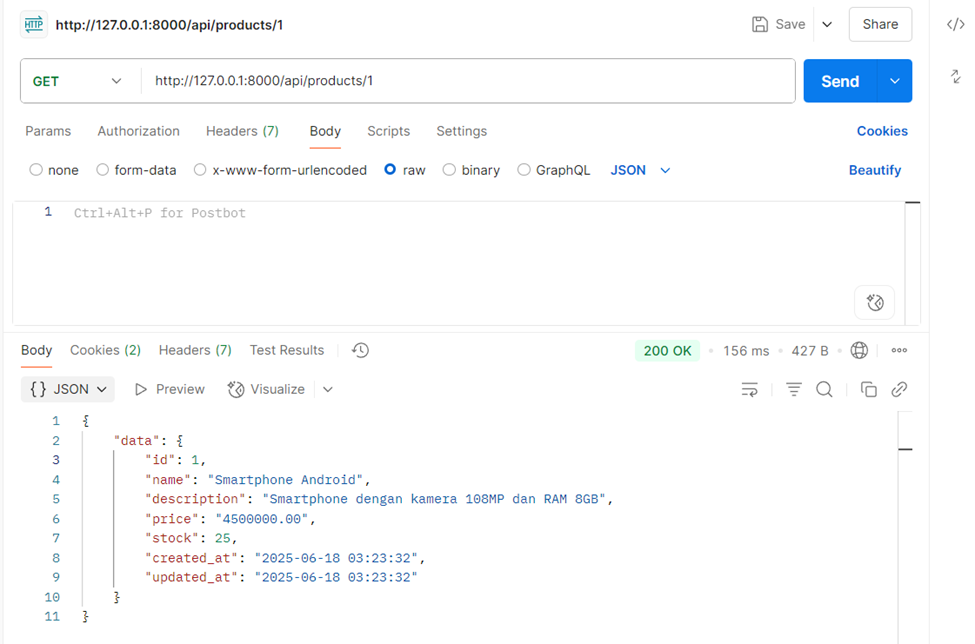 Method: GET dengan Contoh: http://localhost:8000/products/1