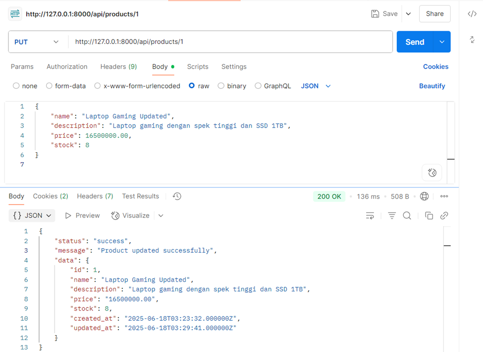 Method: PUT dengan Contoh: http://localhost:8000/products/1