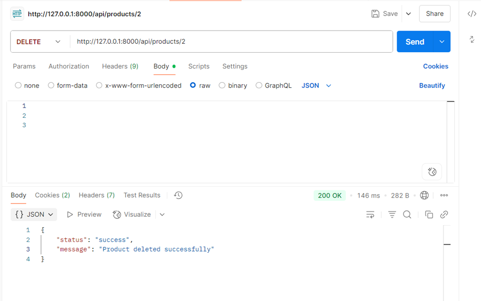 Method: DELETE dengan Contoh: http://localhost:8000/products/1