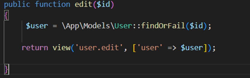 Jika salah satu tombol diatas diklik maka akan menghasilkan string url http://localhost/users/{user}/edit yang mana {user} merupakan id dari user yang di klik. Selanjutnya buka action edit pada UserController dan isikan denga kode program berikut.