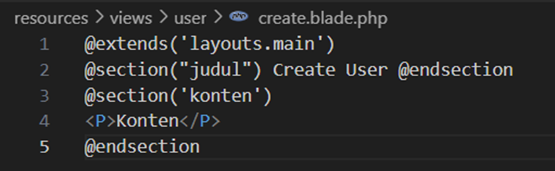 Perintah return view(‘user.create’) artinya menampilkan view create pada folder user,