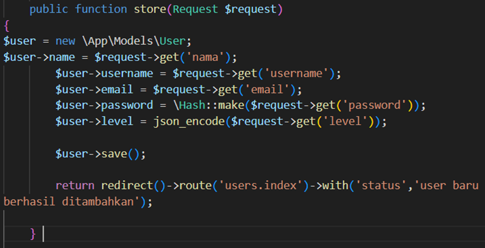 Selanjutnya buka action store pada UserController kemudian isikan kode program berikut.