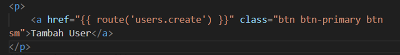 Selanjutnya menambahkan button untuk membuka form tambah user seperti kode program berikut ke dalam index.blade.php