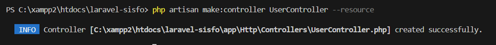 buka vscode dimana disana membuka folder yang kemarin laravel-auth lalu ketikkan pada bagian terminal untuk menambahkan didalam controller berupa UserController.