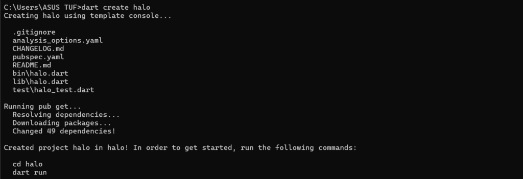 untuk menjalankannya gunakan code berupa “cd halo” dan “dart run” sehingga akan menghasilkan output seperti dibawah ini.