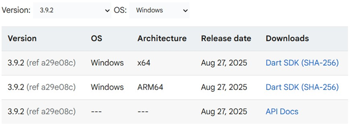 - Download SDK Dart pada halaman Dart SDK archive https://dart.dev/getdart/archive#stable-channel