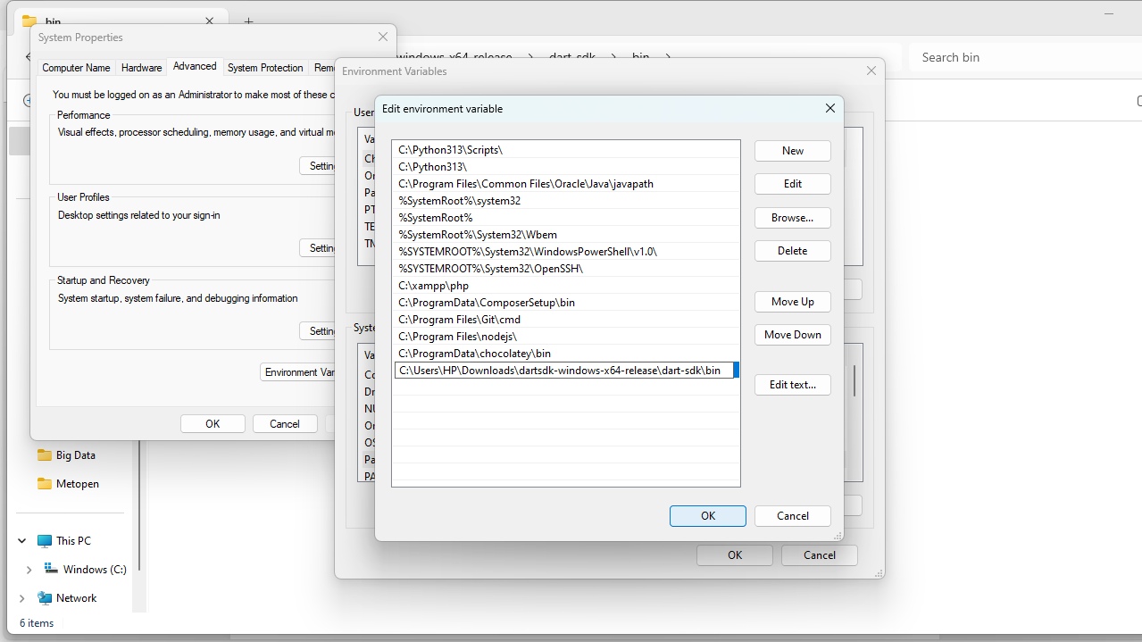 Pilih Path → Edit dan tambahkan Path dari SDK Dart C:\dart-sdk (tempat menyimpan hasil install dart sebelumnya). Kemudian cek pada cmd apakah dart terseebut sudah terinstall atau belum