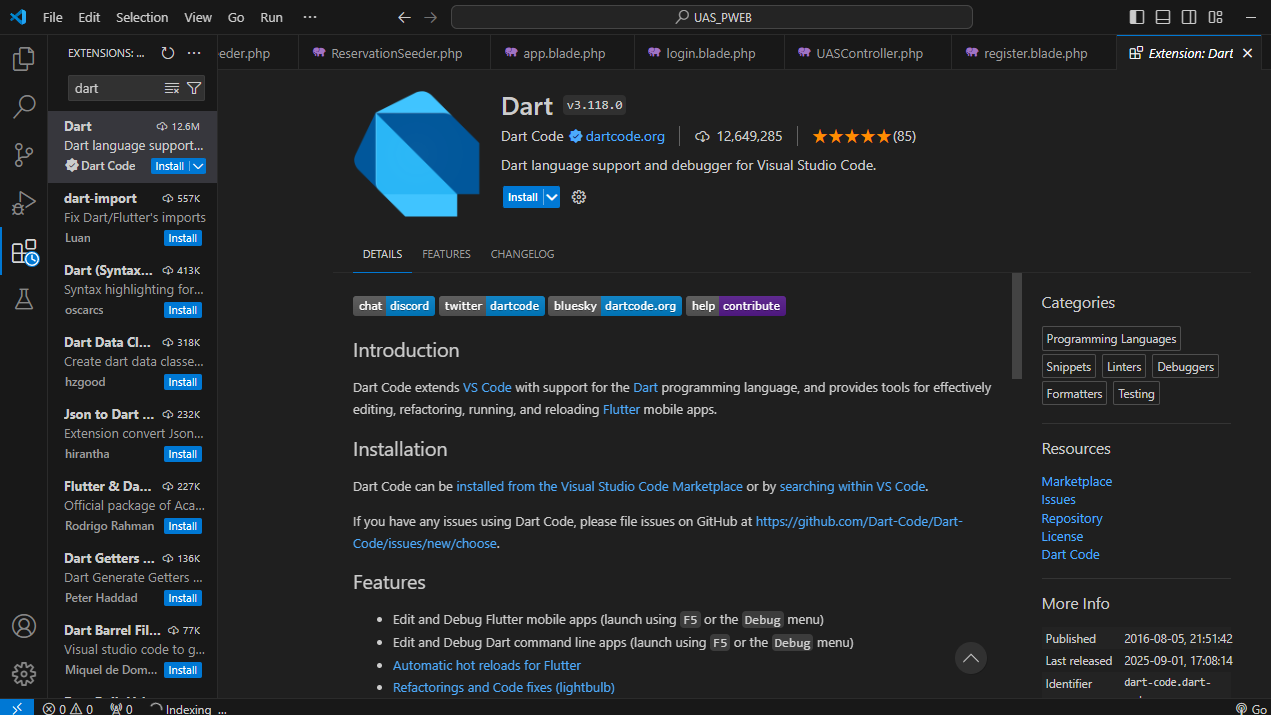 lanjut masuk kedalam vs code, dan instal “Dart” di dalamnya.