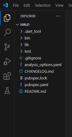 Setelah berhasil membuat proyek pertama Dart dengan nama halo, buka VSCode kemudian buka proyek halo yang sudah dibuat dan tampilannya akan seperti ini :