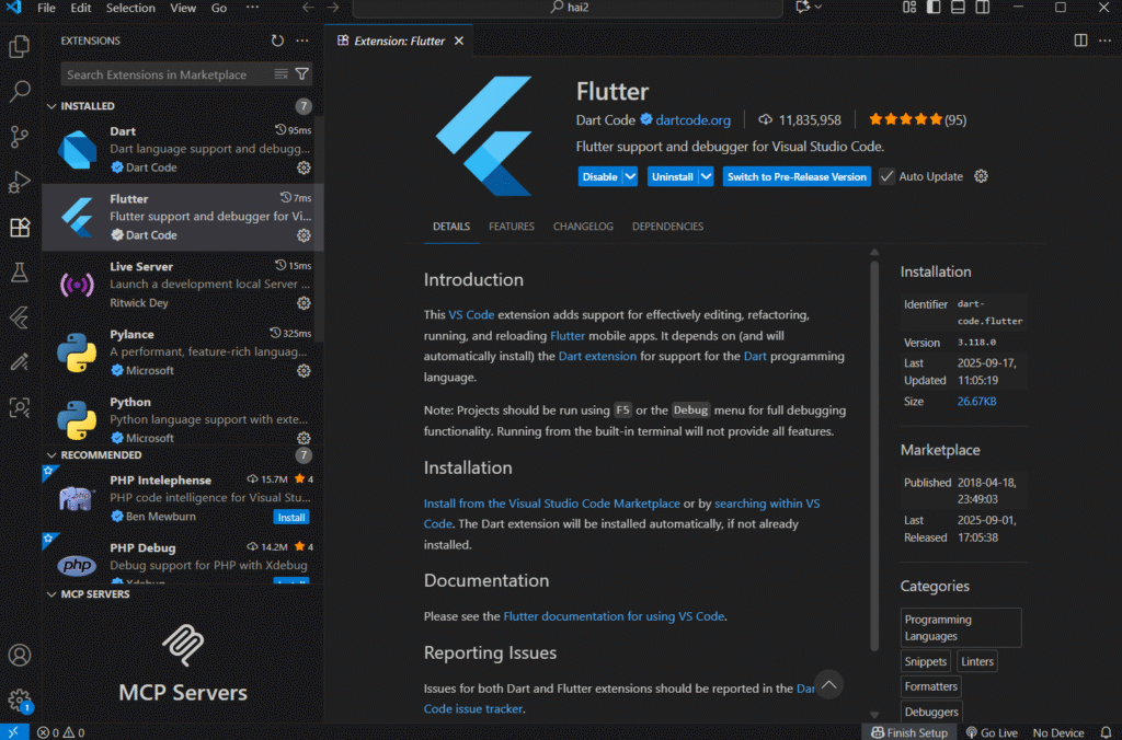Buka aplikasi visual studio code, pastikan ekstensi Flutter sudah ada di Visual Studio Code tersebut