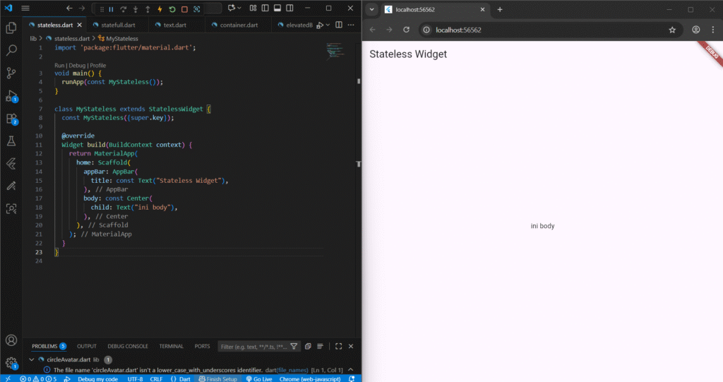 - Stateless – widget yang data atau tampilannya tidak mengalami perubahan ketika sebuah state dijalankan, Widget ini bersifat statis atau tetap misalnya teks statis, logo aplikasi dll