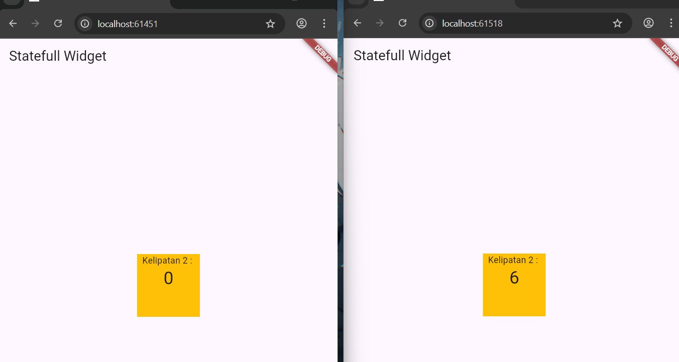 - Statefull – widget dinamis yang ketika sebuah state berubah maka tampilan UI juga berubah. contohnya ketika tombol diklik atau ditekan maka tombol berubah warna atau form input nilainya berubah.
