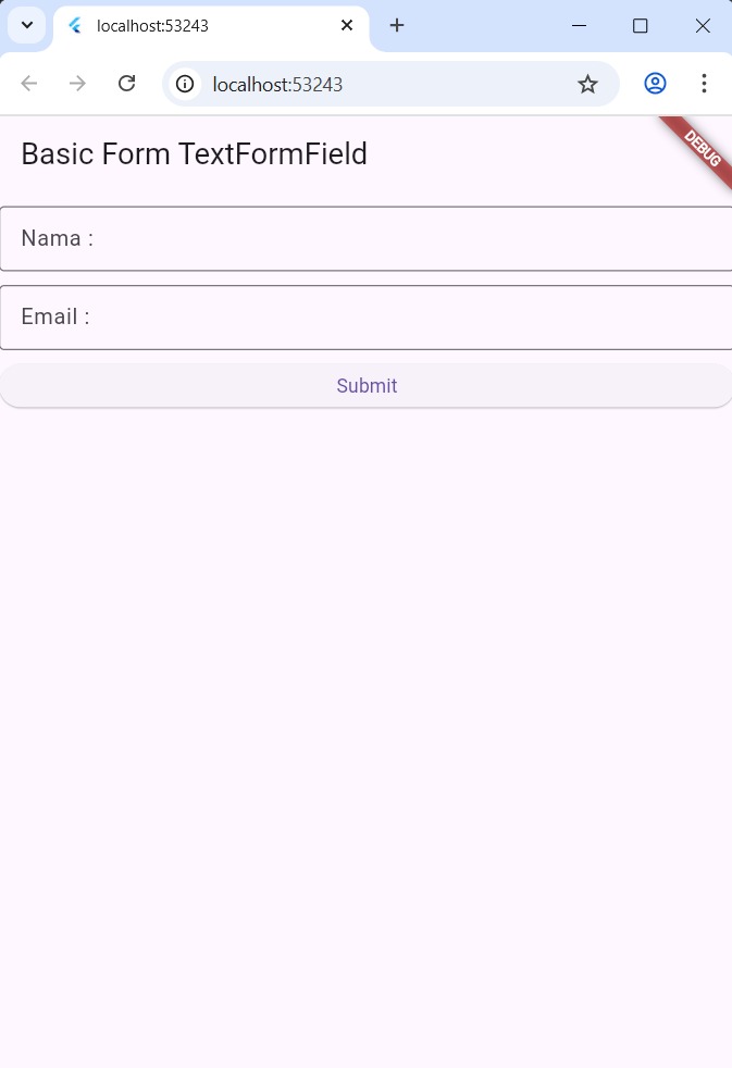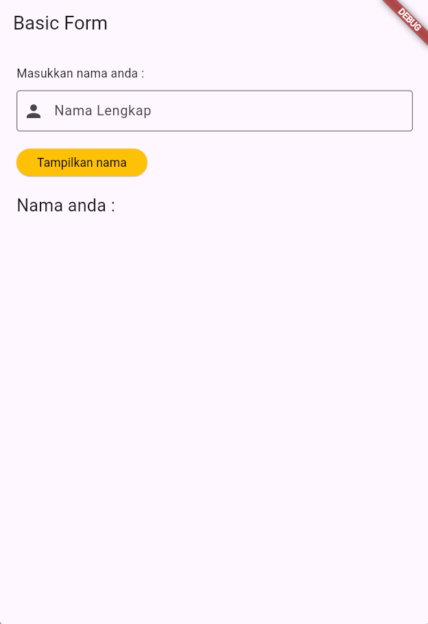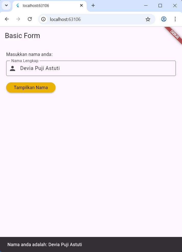 Basic Form merupakan widget yang berfungsi sebagai inputan nilai seperti TextField, TextFormField, CheckBox, Switch, Dropdown, Radio, Dialog, DatePicker, BottomSheet, Snackbar dan lain-lain. Basic Form digunakan untuk validasi dan mengelola inputan dari berbagai field. Form ini akan memberikan tampilan inputan kemudian inputan akan diperiksa apakah sudah sesuai dengan aturan atau format yang ditetapkan, selanjtunya data inputan akan diambil nilainya setelah proses pengecekan selesai dilakukan.