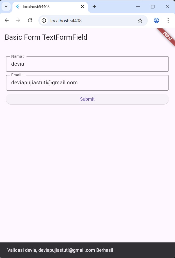 SnackBar(content: Text('Validasi $name, $email Berhasil')));