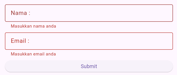 dalam pengisiannya Ketika ElevatedButton ditekan dan TextField kosong dan ketika ElevatedButton ditekan dan TextField salah format maka nanti hasilnya akan merah